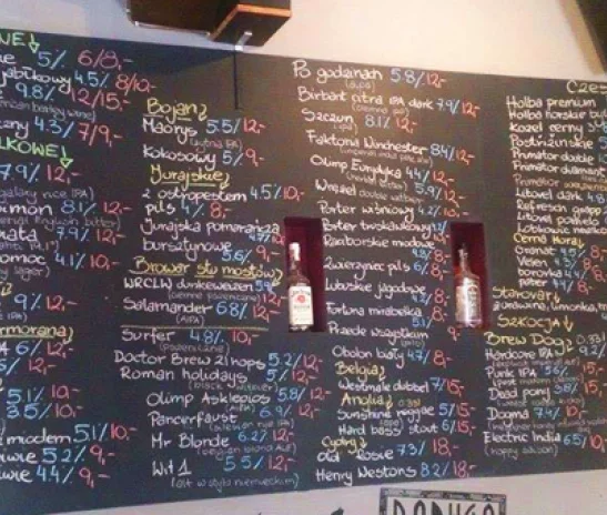 Bar wyposażony jest w 13 nalewaków, w tym z jednego zawsze leje się likier ziołowy. Na kranach królują piwa z polskich browarów rzemieślniczych, często można znaleźć tu też piwa od naszych sąsiadów: Czechów i Niemców. W trakcie różnych wydarzeń można napić się ciekawych drinków z piwem w roli głównej, a w standardowej ofercie znajdują się fantazyjne koktajle stworzone z kolorowych alkoholi. Ofertę piw z kija, świetnie uzupełnia kilkadziesiąt trunków w butelkach. Jest w czym wybierać, a dobrze wyselekcjonowane napoje zadowolą nawet najbardziej wybredne gusta.