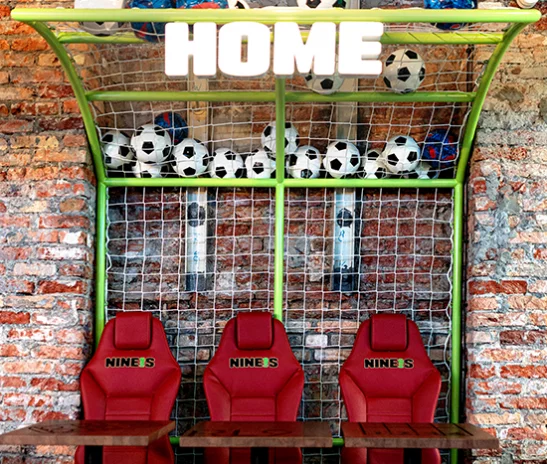 W skład NINE’s wchodzi sports bar, dwupoziomowa restauracja oraz unikalna przestrzeń eventowa z prawdziwą trybuną, a także ogród, który docelowo będzie całoroczny. To 3 przestrzenie, które są ze sobą spójne, ale jednocześnie różnią się na tyle, by dawać gościom inne doświadczenia. NINE’s to świątynia sportu, nie tylko piłki nożnej, chociaż osoba Roberta Lewandowskiego stanowi tutaj ważny element i my, Polacy, najbardziej emocjonujemy się tą dyscypliną. NINE’s chce oddać hołd wszystkim sportowcom, co znajduje odzwierciedlenie w wystroju tego miejsca.