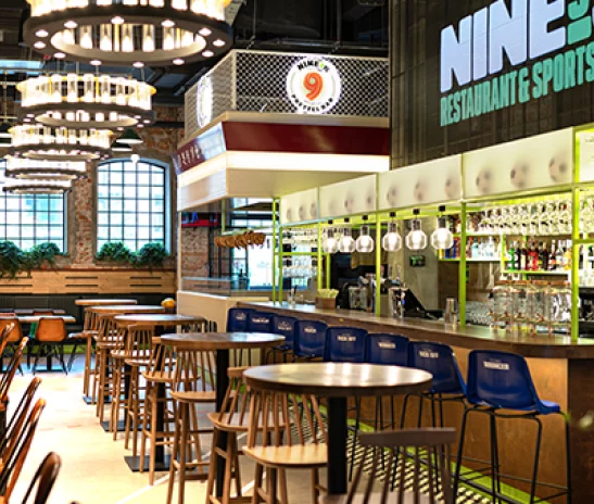 Jednak sports bar to przestrzeń, gdzie dominują sportowe emocje, a jedzenie schodzi na dalszy plan – to ponad 20 ekranów, 4 niezależne sygnały do oglądania transmisji sportowych, oktagonalny bar oraz karty dań i baru dopasowane do dzielenia się i przeżywania sportowych emocji razem. W sports barze piwo serwowane jest w wyjątkowych kuflach nawiązujących do najlepszych bawarskich wzorców. Są one ozdobione podwójnym logo Nine’s i Heinekena, który jest partnerem lokalu ze względu na swoje trwające od ćwierć wieku partnerstwo z Ligą Mistrzów UEFA. Oprócz tego można w NINE’s spróbować wielu różnych piwnych koktajli – piwo kojarzy się głównie z mężczyznami, a tu możemy poznać jego bardziej kobiecą, lekką odsłonę. To kolejny przykład tego, jak można zaprezentować powszechnie znane smaki w zupełnie nowy, odkrywczy sposób.