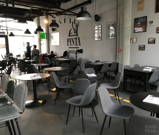 Po wejściu do Pinty wita surowe, industrialne, wręcz ascetyczne wnętrze. Ściany z pociętych kontenerów, podłoga z betonu, a na niej rozrysowane strzałki i linie, niczym w hali produkcyjnej, po której co chwilę pędzą wózki widłowe. Miejsc do siedzenia jest całkiem sporo, bo około 100, ale większość z nich to twarde krzesła, przypominające design lat 80. Pinta Wrocław z pewnością przypadnie do gustu zwolennikom industrialnej postapokalipsy 😉